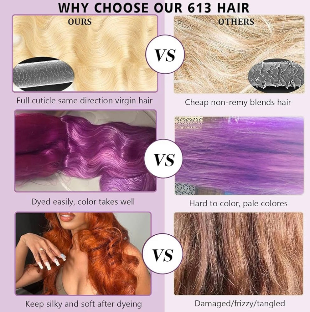 - 613 Bundles Material: All of our 613 bundles are 100% made of high-quality human hair, which is why they will keep super soft and silky after multiple washes and dyeing, very clean and healthy